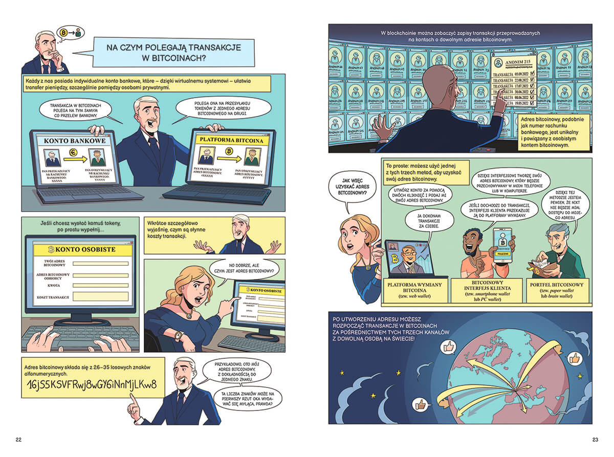 Ten wyjątkowy komiks dla nastoletnich i dorosłych czytelników, opowiadający o świecie finansów, to jedna z pierwszych prób uchwycenia, w sposób przystępny i zrozumiały dla laików, zagadnień związanych z bitcoinem i blockchainem.